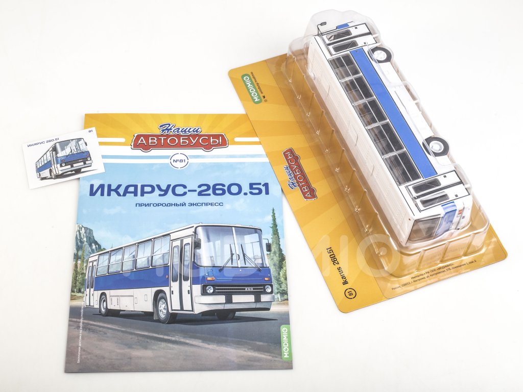 МОДИМИО нет-нет, да и порадует интересной редкой вещицей. Модель Икаруса-260.51 до этого практически никем не выпускалась. А если вы родом из СССР, то это - бальзам на душу. В Союз такие автобусы, по традиции, поставлялись с кузовом в охре и белыми дверями. В Костроме вначале 90-х бегал такой с гаражным номером "150" по городскому экспресс-маршруту. В конце 90-х, когда на пригороде "добивали" последние ЛАЗы и 677-е ЛиАЗы, начали пригонять из Венгрии и бывшей ГДР вот такие б/ушные двухдверные Икарусы в бело-голубом и ином окрасе. А, приблизительно, году к 2015-му закат эпохи Икарусов 260-й, 280-й серии был оформлен .